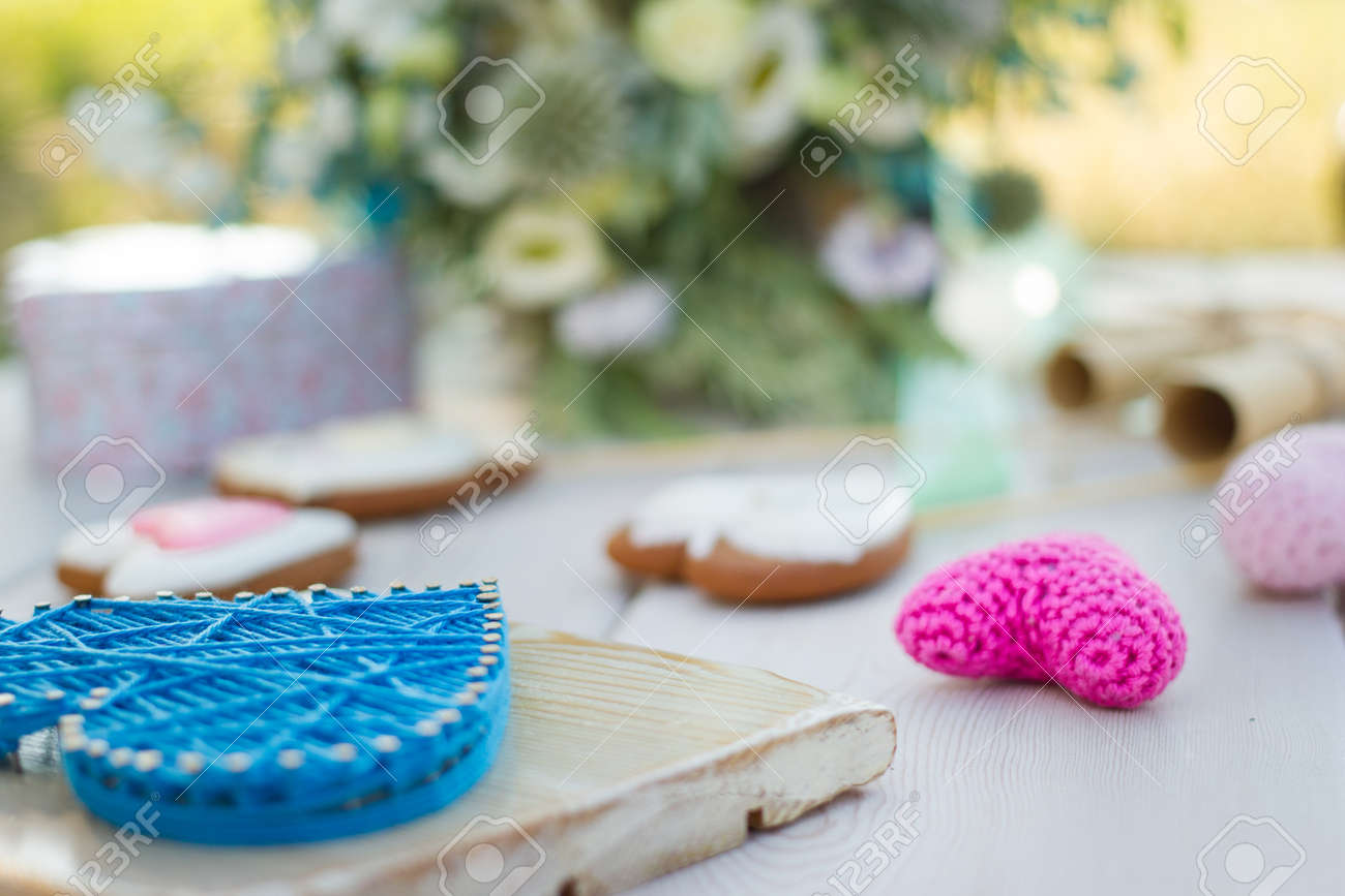 Close Up View On String Art And Crochet Heart Shaped Wedding